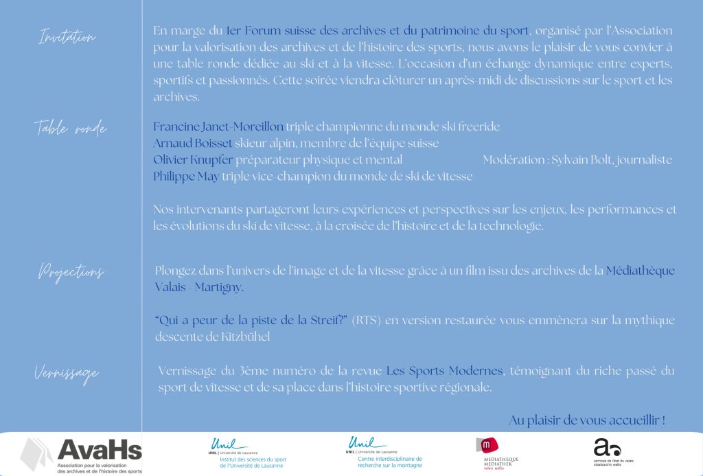 Vernissage, projection de films sur la vitesse (remastérisés par les Archives de la RTS) et apéritif dînatoire.